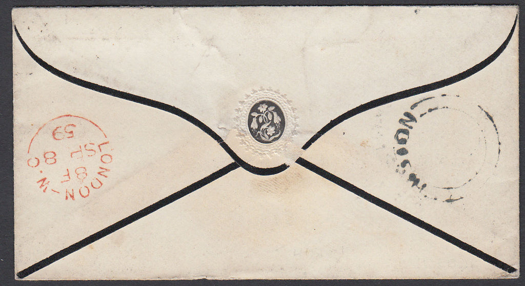 1859 CAMBS/'HISTON' UDC. Fine mourning envelope Cambridge to London with fibe Die 2 1d rose-red on white paper (SG40) lettered RI tied CAMBRIDGE sideways duplex SP 7 59. On reverse good strike HISTON udc in black. (Ref 87315).