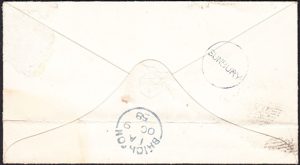 1858 MIDDX/'SUNBURY' UDC. Envelope London to Brighton with Die 2 1d rose-red on white paper (SG40) lettered CD tied LONDON/SW19 duplex OC 8 58 (filing fold affects), on reverse very fine strike circular SUNBURY udc in black (19mm) in black. (Ref 87934).