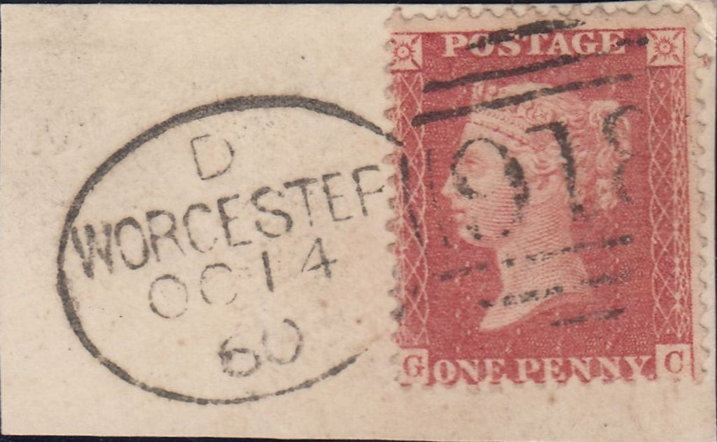 1860 WORCESTER/918 SPOON FIRST RECUT (RA128)/PL.27 (SG40)(GC). Small piece with fine used 1857 die 2 1d pl.27 rose-red on white paper (SG40) lettered GC tied fine strike WORCESTER/918 spoon first recut (RA128) OC 14 60 code D. (Ref 119919).