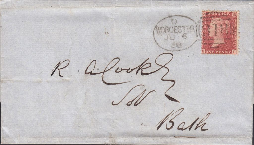 WORCESTER '918' SPOON ORIGINAL HAND STAMP (RA127)/PL.27 (HL)(SG40). Fine wrapper Worcester to 'R A Cook Esq Solr Bath' with fine die 2 1d pl.27 rose-red on white paper (SG40) lettered HL tied fine to very fine strike WORCESTER/918 original spoon JU 6 58 code D. (Ref 119921).