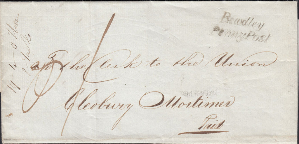 1839 MAIL BEWDLEY (WORCS) TO CLEOBURY MORTIMER (SHROPS) WITH 'BEWDLEY/PENNY POST' HAND STAMP (WO84). Fine wrapper with account in respect of Rice, Cheese and Sugar from Bewdley 'To the Clerk of the Union Cleobury Mortimer' dated circa July 1839 and post paid '1'. On front fine strike 'Bewdley/Penny Post' hand stamp in black (WO84). (Ref 125787).