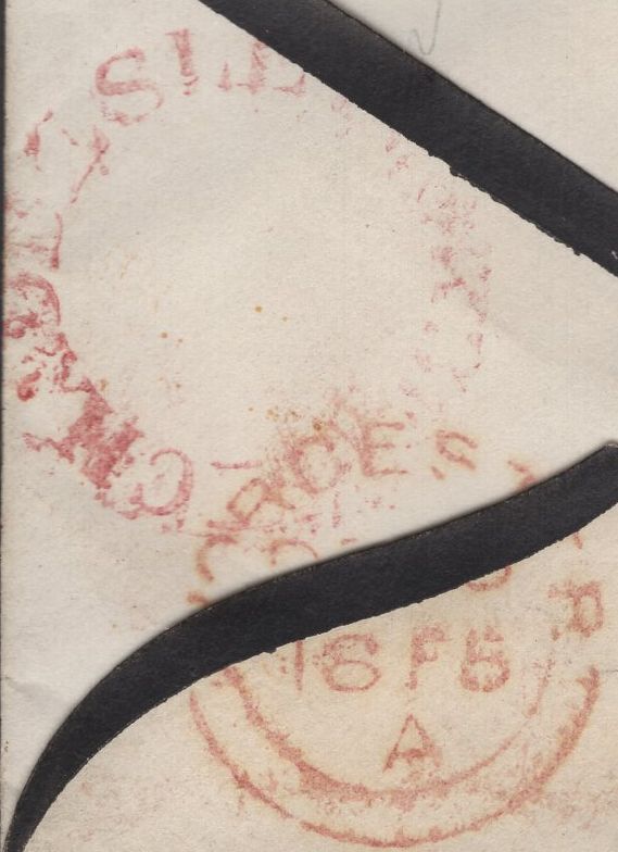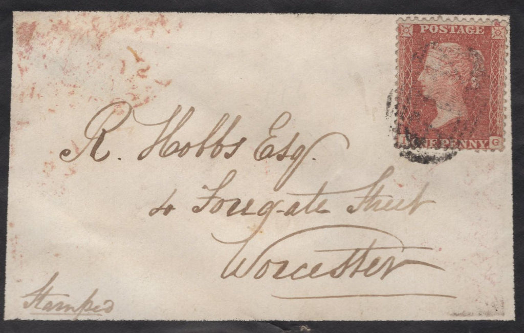 1855 MOURNING ENVELOPE KIDDERMINSTER TO WORCESTER WITH 1D PL.6 (SG24)(IG) 'CHADDESLEY-CORBETT' UDC (WO177). Fine mourning envelope from Kidderminster to 'R Hobbs Esq, 4 Foregate Street, Worcester' with good die 2 1d pl.6 S.C.14 (SG24) lettered IG, short perforation at foot, tied '415' numeral of Kidderminster. On reverse good large part strike 'CHADDESLEY-CORBETT' udc in red (WO177) and 'KIDDERMINSTER' date stamp DE 14 1855. (Ref 136757).