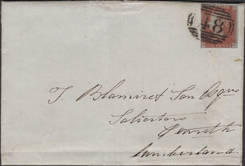 1844 MAIL COLLINGWOOD MANOR TO PENRITH WITH 'ROMALD-KIRK' UDC (YK2409) AND 'PENRITH' SKELETON DATE STAMP (CU395). Fine letter from 'Collingwood Manor' to 'T Blamiret Son Esqrs, Solicitors, Penrith, Cumberland' with 1d (SG8) lettered NJ with fine four margins and tied fine strike '48' numeral of Barnard Castle. On reverse fine strike 'ROMALD-KIRK' udc (YK2409), North Yorkshire and fine strike 'PENRITH' skeleton date stamp in green DE 27 1844, this being the only year of recorded use (CU395). Also on reverse 'BARNARD CASTLE' date stamp DE 27 1844. (Ref 135006).