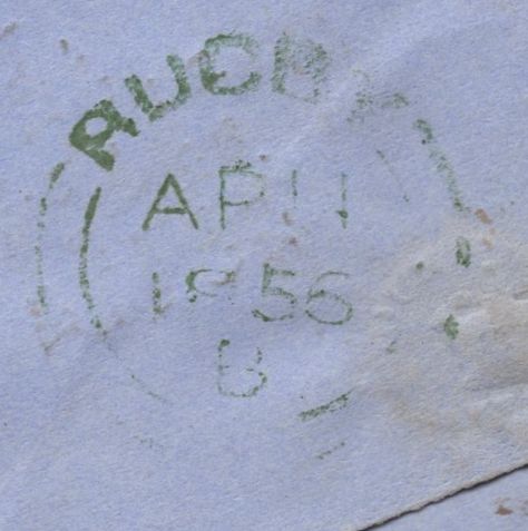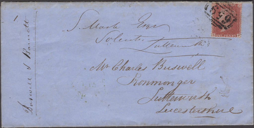 1855 MAIL RUGBY, NORTHANTS TO LUTTERWORTH WITH 1D PL.35 (SG29)(SF). Letter from Rugby to Lutterworth with good die 2 1d pl.35 red-brown on blued paper (SG29) lettered SF tied fine strike '659' numeral of Rugby, several short perforations. On reverse 'RUGBY' date stamp AP 11 1855. (Ref 135172).