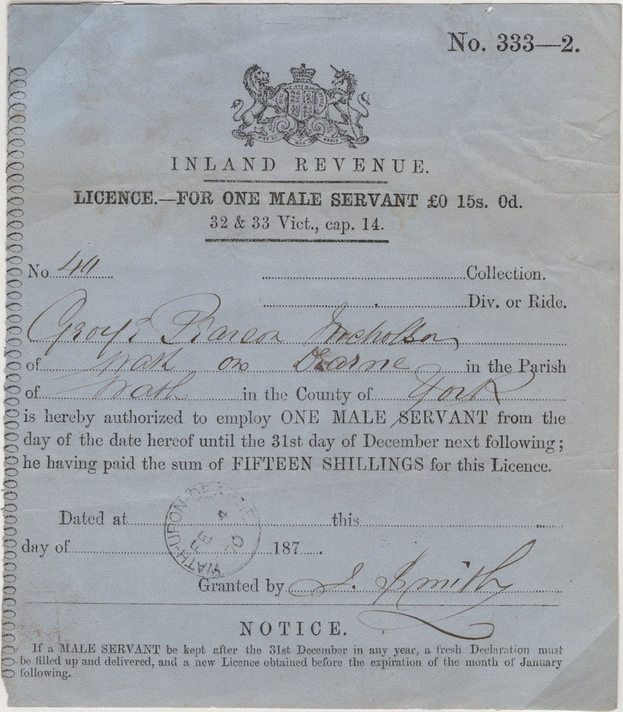 1870 'INLAND REVENUE/LICENCE FOR ONE MALE SERVANT £0 15s. 0d.'. Good to fine 'INLAND REVENUE/LICENCE FOR ONE MALE SERVANT £0 15s. 0d.', slight soiling with good to fine strike 'WATH-UPON-DEARNE' single ring date stamp FE 4 70, Yorkshire. (Ref 138736).