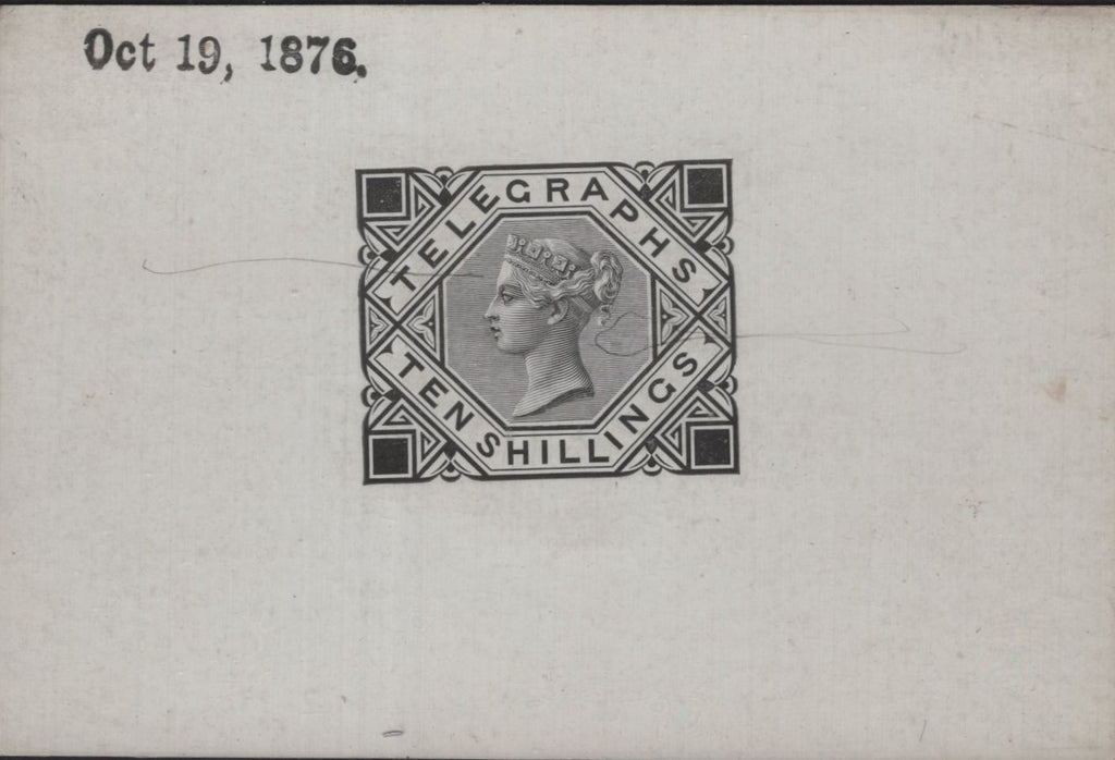 1876 10s TELEGRAPH DIE PROOF (T16/L235). A very fine 1876 10s Telegraph Die Proof in black on white glazed card, 92 x 61mm with date 'Oct 19,1876.' and light pencil manuscript indicating areas that require further attention. (Ref 139941).