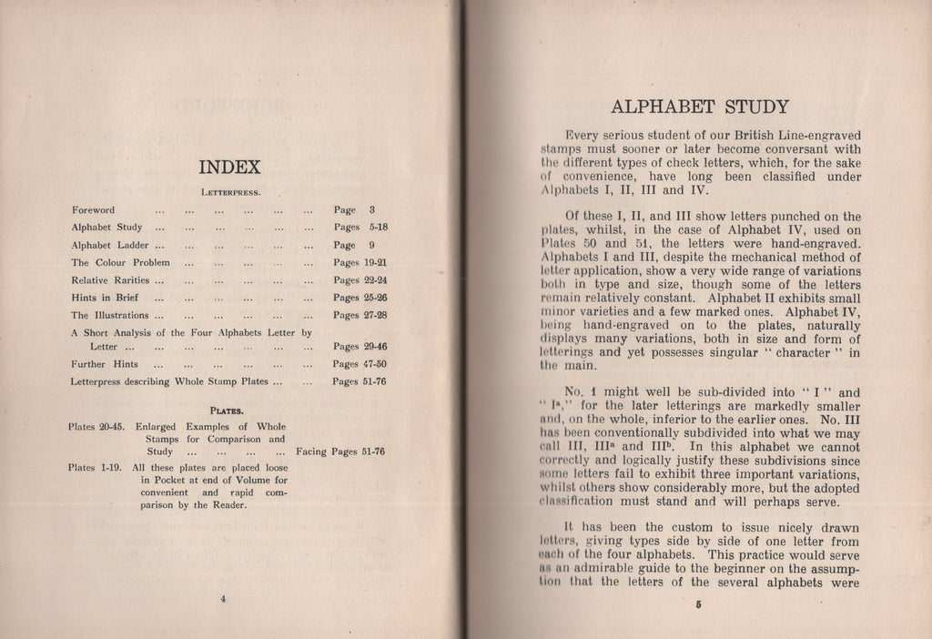'THE ALPHABETS OF THE BRITISH LINE ENGRAVED STAMPS' BY R C ALCOCK. A fine copy of this excellent Alcock publication, 1937 second edition hardback, 80 pages with excellent detail on the four alphabets and excellent illustrations. Struggling to identify the alphabets? Struggling to identify an Archer experimental perforation? then this book is for you. (Ref 140424).