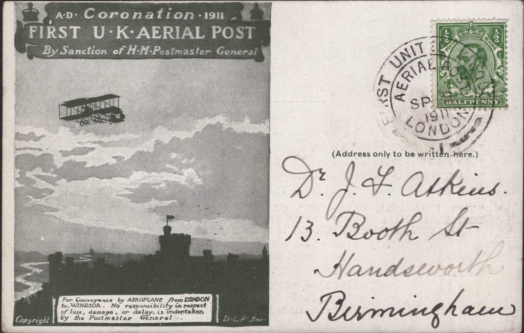 1911 U.K. FIRST AERIAL POST, LONDON POSTCARD IN OLIVE' GREEN TO BIRMINGHAM WITH 'THE FINANCIAL OUTLOOK' ADVERT. Fine London postcard in olive-green to Handsworth, Birmingham with KGV ½d tied good strike 'FIRST UNITED KINGDOM/AERIAL POST LONDON' date stamp SP 9 1911 die 1. On reverse very fine printed advert 'THE FINANCIAL OUTLOOK. THE FINANCIAL OUTLOOK GRANTS A FREE DEAL TO ALL SUBSCRIBERS, WITH AN OPPORTUNITY OF GAINING A PROFIT OF £10. YOU CHOOSE YOUR OWN STOCK AND YOUR OWN TIME'. (Ref 140748).