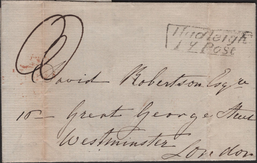 1831 MAIL HADLEIGH, SUFFOLK TO LONDON WITH 'Hadleigh/Py Post' HAND STAMP (SK159). Large part wrapper from Hadleigh to 'David Robertson Esq, 16 Great George Street, Westminster, London', charged '10' and on front good strike boxed 'Hadleigh/Py Post' hand stamp in black (SK159). On reverse London date stamp 14 SP 1831. (Ref 140978).