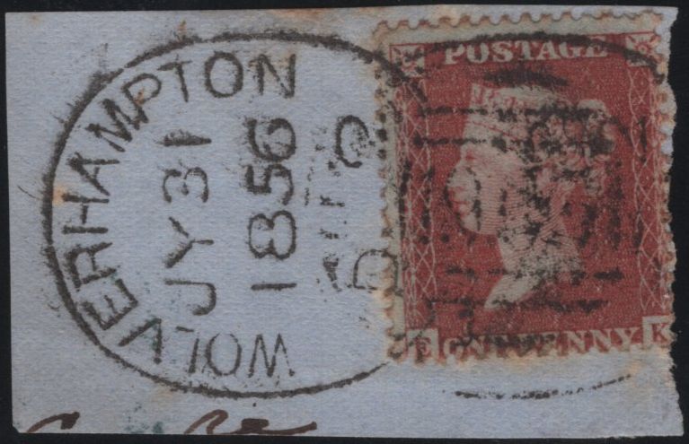 1856 SMALL PIECE 'WOLVERHAMPTON'905' SPOON TYPE 'B' (RA126). Small piece good used Die 2 1d red-brown on blued paper (SG29) lettered EK tied good to fine strike 'WOLVERHAMPTON/905' spoon type 'B' (RA126) JY 31 1856 code 'D'. (Ref 141161).