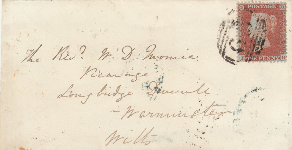 1855 MAIL BERKHAMPSTEAD, HERTS TO WARMINSTER DIE 1 1D RES.PL.5 (SG22). Envelope from Berkhampstead to Warminster with Die 1 1d Res.pl.5 S.C.14 (SG22) lettered IG, usual short/missing perforations, tied '65' numeral of Berkhampstead. On reverse 'BERKHAMPSTEAD' date stamp MY 8 1855. MISSING IMPRIMARTUR LETTERING. (Ref 141501).