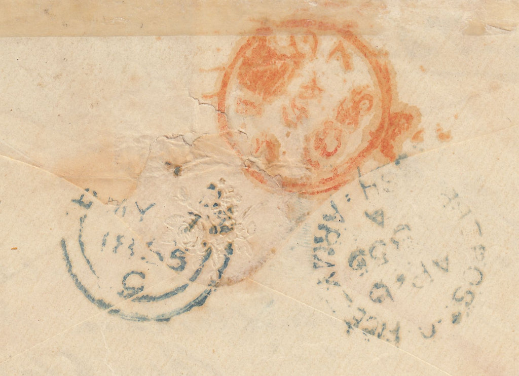 • 141553 1855 CRIMEAN WAR ENVELOPE CONSTANTINOPLE TO BRIGHTON, SUSSEX WITH STRIP OF THREE 1D (SG17) WITH '*CROWN*' CANCELLATION.