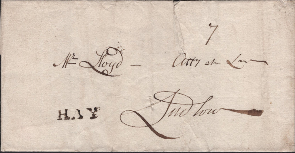 1799 MAIL HAY, BRECON TO LUDLOW WITH 'HAY' HANDSTAMP (W1115). Wrapper, tear at top, from Hay to 'Mr Lloyd, Atty at Law at Ludlow'. charged '7', on front fine strike 'HAY' straight line handstamp in black (W1115). (Ref 141581).