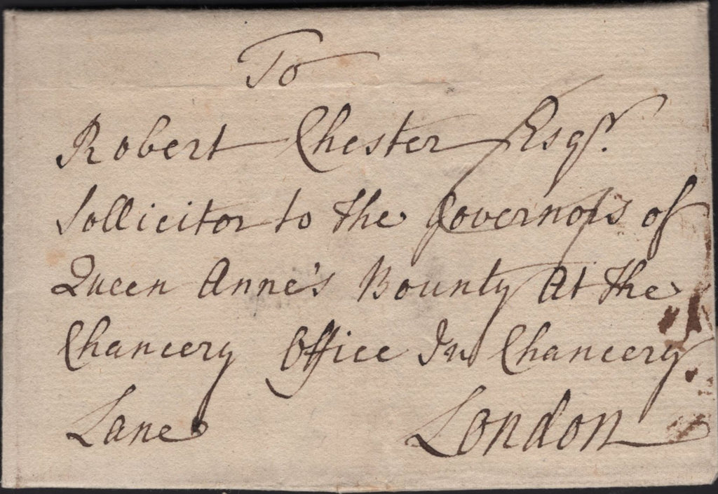 1768 MAIL BUILTH, BRECON TO QUEEN ANNE'S BOUNTY IN LONDON WITH 'HAY' HANDSTAMP (W1110) AND REFERENCE TO 'MONMOUTH CARRIER'. Letter from Gwenthor near Builth. Breconshire dated June 23 1768 'To Robert Chester Esqr, Solicitor to the Governors of Queen Anne's Bounty at the Chancery Office in Chancery Lane, London', on reverse light strike 'HAY' straight line handstamp in black (W1110) and London Bishopmark '27/JV'. Writer refers to a deed requesting it to be drawn as soon as possible 'and sent by Monmouth Carrier to Brecknock or by the Hereford Carrier to Hay....'. (Ref 141583).