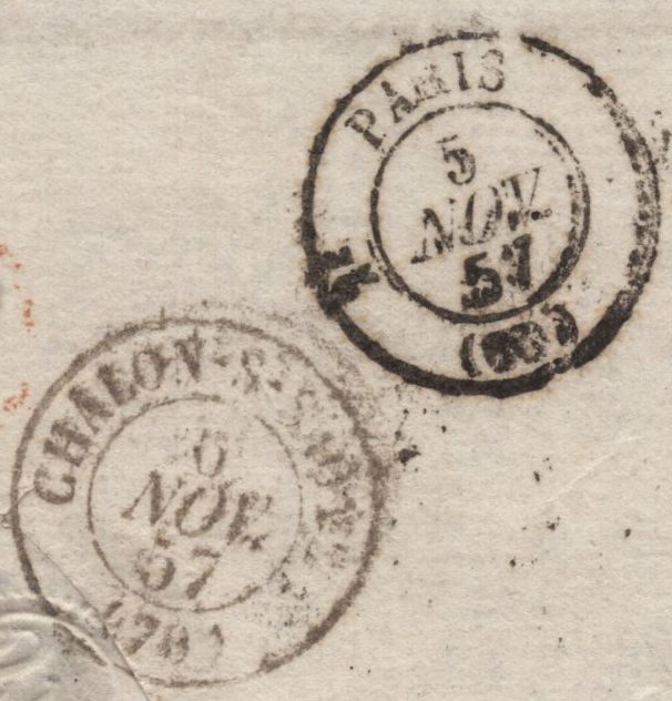 1857 MAIL LONDON TO CHALON, FRANCE WITH 2D BLUE (SG35) AND 6D LILAC (SG68). Entire letter from London to Chalon in France with 2d blue (SG35) centred to lower left and 6d lilac (SG68), fault at top, tied London numerals, on front 'CALAIS' date stamp 5 NOV 57. On reverse 'LONDON' date stamp NO 4 57 in blue and 'CHALON-S-SAONE' date stamp 6 NOV 57. (Ref 141606).
