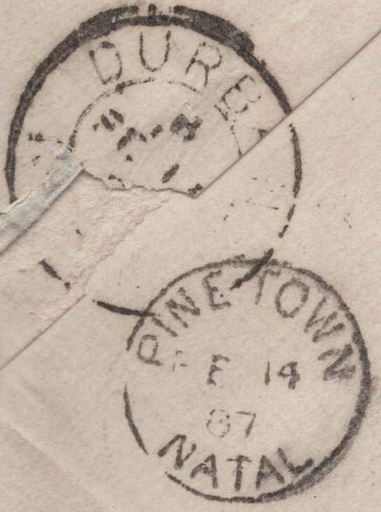 1887 MAIL STOCKWELL, LONDON TO NATAL WITH 6D GREEN (SG194). Fine envelope from Stockwell to 'Lieut N C Woollett, Royal Inniskilling Fusiliers, Durban, Natal', with Durban crossed through and re-directed to Pinetown, fine 6d green (SG194) lettered EK tied fine strike 'STOCKWELL.SW/27B' duplex JA 13 87. Also on front fine strike 'DURBAN/NATAL' date stamp FE 13 87, on reverse 'PINETOWN/NATAL' date stamp FE 14 87. Fine usage. (Ref 141629).