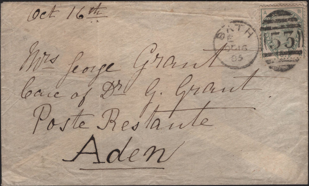 1885 MAIL BATH TO ADEN WITH 5D GREEN (SG193). Envelope, slight creasing, from Bath to 'Mrs George Grant, Care of Dr G. Grant, Poste Restante, Aden' with fine 5d green (SG193) lettered BA tied good strike 'BATH/53' duplex OC 16 85. On reverse light strike 'ADEN' date stamp 28 OCT. Very scarce destination. (Ref 141630).